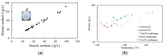 The branched structure of random copolymer PP molecules exhibits rheological properties, such as high melt strength and rapid crystallization, that assure easy stabilization of the foaming beads. We tested WB260 HMS with isobutane and CO2 as blowing agents and compared the resulting foamed beads. The PP can be foamed within a broad range of melt temperature and density can be tuned between 100 to 20 g/L. The most relevant pressure for the foaming, the one at the die plate, was kept constant as much as possible between 150 and 200 bar. Figure 3a shows the comparison between the foam density measured with the two methods, a and b. As expected, method a (multiple beads density) always gives a lower density than the one measured with method b (single bead density) and the difference is ca. 40%. The insert d in Figure 3a shows the picture of an ePP bead with a foam density of 30 g/L. In the rest of the paper, density will always be the multiple beads density, that is, the density used by industry to define the requirements of ePP for automotives. Figure 3b shows the bulk density (in scale log-log) as a function of melt temperature, Tfoam, for five different blowing agent concentrations. For each concentration of blowing agent, we identify an optimum for foaming temperature, , at which we reach a low density and high concentration of a closed cell. Tfoam is a very important process variable for defining the final foam structure both in terms of density and morphology. A bell-shaped curve typically describes the effect of Tfoam on the foam density, with a maximum of the expansion ratio at optimal temperature, Below , the viscosity of the polymer increases, and crystallization or vitrification may occur [,,]. Above , the reduction of the polymer viscosity induces bubble coalescence, and the increased diffusivity of the blowing agent is responsible for its loss through the external surface of the strand, followed by a corresponding reduction of foaming efficiency. All those phenomena hinder bubble growth. The foaming window is ca. 10 °C wide.