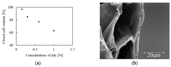 (a) Closed cell content as function of talc content; (b) cell wall thickness detail.