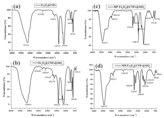 FTIR spectra of (a) Fe3O4@CNFs, (b) Fe3O4@SiO2@CNFs, (c) IIP-Fe3O4@@SiO2CNFs and (d) NIP-Fe3O4@SiO2@CNFs.