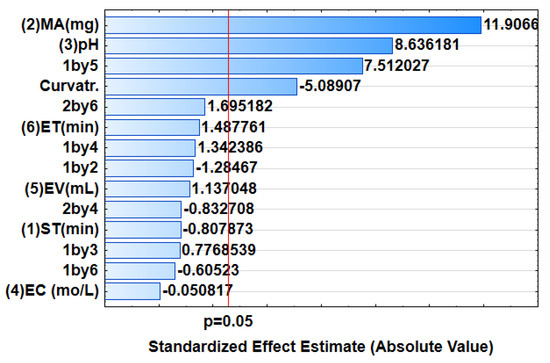 The fractional factorial design 26−2 (FrFD) was used for selection of the most influential experimental parameters (eluent concentration (EC), sonication time (ST), elution time (ET), eluent volume (EV), mass of adsorbent (MA) and sample pH). The design matrix and the analytical response are presented in Table S2. The data was processed using Statistica version 13 software. The analysis of variance (ANOVA) was used to examine the significance of each independent factors. ANOVA results presented as Pareto chart (Figure 5) was used to assess the importance of independent variables and their interactions [49]. The results obtained on the Pareto chart showed that MA and pH were significant at 95% confidence level. This means that the two independent variables played a significant role in the preconcentration of Sb(III). Therefore, further optimisation was required to give optimum conditions for MA and pH.