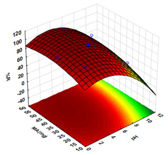 For further optimisation, response surface methodology (RSM) based on central composite design (CCD) was used to evaluate the interaction between MA and pH. The CCD matrix and respective analytical response are shown in Table S3. The 3D response surface plot shows the analytical response against individual factors (Figure 6). As can be seen in Figure 6, an enhanced analytical response (% recovery) at a pH value between 2 and 4 was observed and, for the MA, maximum recoveries were achieved at a mass between 50 and 60 mg. Above pH 4, lower recoveries were observed, and this might be due to the reduced interactions between the negatively charged analyte and positively charged adsorbent.
