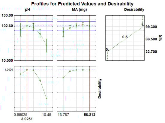 In Figure 7, the desirability functions of 0.0, 0.5 and 1.0 were assigned to undesirable (33.7%), middle (66.5%) and desirable (maximum recoveries, (99.3%), respectively. Herein, the desirability score of 1.0 was chosen to estimate the desirable optimal parameters. Therefore, based on the screening results and desirability score of 1.0, the optimum conditions, were, 3.0, 56 mg, 3.0 mol L−1, 10 min, 20 min and 7.0 mL, for pH, MA, EC, ST, ET and EV, respectively. These conditions were confirmed experimentally (in triplicates) and the experimental recoveries (98.7 ± 1.2%) agreed with the RSM predicted value (99.3%) at 95% confidence level.
