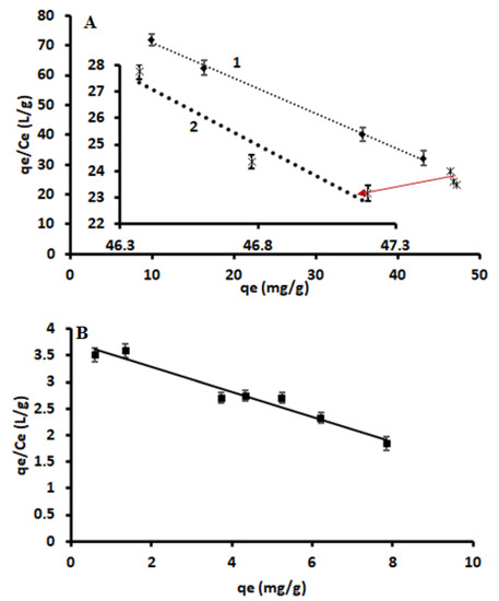 where qe (mg/g) is the adsorption or binding capacity at equilibrium, Ce is the residual concentration of Sb(III) at equilibrium, Kd (mg/L) is the equilibrium dissociation constant at binding sites and qmax (mg/g) is the maximum binding [32]. The values of Kd and qmax were calculated from the slope and the intercept of the linear plot of qe/Ce versus qe [32]. According to the literature, Scatchard plot shape is correlated to the nature of the interaction between the adsorbate and adsorbent [47,50]. For example, if the plot of qe/Ce versus qe forms one straight line, this suggests that there is only one type of binding site on the surface of the sorbent [31]. Furthermore, when the Scatchard plot displays an anomaly from linearity (showing two linear plots in one set of data), the results suggest that the adsorbent has more than one type of binding site. These binding sites can be categorised as high-affinity (low Kd value) and low-affinity (high Kd value) binding sites [51,52]. Figure 8 shows the Scatchard plots of Sb(III)-IIP-Fe3O4@SiO2@CNFs and NIP-Fe3O4@SiO2@CNFs. As seen in Figure 8A, the Scatchard plot for Sb(III)-IIP-Fe3O4@SiO2@CNFs was nonlinear and it was divided into two linear sections that had two different slopes. As discussed earlier, these observations suggest that IIP@Fe3O4@CNF@SiO2 had two types of binding sites that have different affinities for the adsorption of Sb(III). On the contrary, the Scatchard plot of NIP-Fe3O4@SiO2@CNFs (Figure 8B) fitted to one linear curve, suggesting that NIP had only one type of binding site.