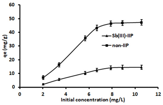 The adsorption of Sb(III) on IIP-Fe3O4@SiO2@CNFs and NIP-Fe3O4@SiO2@CNFs is shown in Figure 9. The Sb(III) adsorption or binding capacity of both IIP-Fe3O4@SiO2@CNFs and NIP-Fe3O4@SiO2@CNFs increased with increasing initial concentration until the saturation point was achieved. The adsorption capacity of IIP-Fe3O4@SiO2@CNFs was found to be higher than that of NIP-Fe3O4@SiO2@CNFs, suggesting that the imprinting played a significant role in the formatting of cavities that are specific to Sb(III). Isotherm models such as Langmuir and Freundlich were used to exam the adsorption behaviour of Sb(III)-IIP-Fe3O4@SiO2@CNFs and NIP-Fe3O4@SiO2@CNFs) towards Sb(III). The linear equations for the isotherm models and their constant parameters are presented in Table 3. The linear plots for Langmuir (Ce/qe vs. Ce) and Freundlich (ln qe vs. ln Ce) models using IIP and NIP are shown in Figures S1–S4. The isotherm constant values were estimated from the slope and intercept of each plot (Table 3). The correlation of determination (R2) values was used to select the model that best explains adsorption results. As seen, the data for Sb(III)-IIP were best described by the Langmuir model (R2 = 0.9969) and the qmax value was 47.4 mg g−1. Furthermore, the qmax obtained from the Langmuir isotherm model was in agreement with the experimental adsorption capacity (46.7 mg g−1). These results suggest that the adsorption process was dominated by a monolayer sorption on homogenous adsorption or binding sites. The R2 (0.9806) of the Freundlich model revealed that there was relative correlation, but Langmuir model explains the adsorption data better. Similarly, adsorption data obtained using NIP-Fe3O4@SiO2@CNFs revealed that the Langmuir model (0.9912) fitted the data better than Freundlich model (0.9869). The adsorption capacity obtained in this study was higher than those reported by Zhang et al. [42] (39.6 mg g−1) and Shakerian et al. [44] (6.7 mg g−1) on the application of IIPs for adsorption antimony The imprinting factor (α = qmax (IIP)/qmax (NIP)) value was found to be 2.82, confirming successful imprinting.