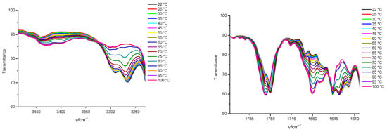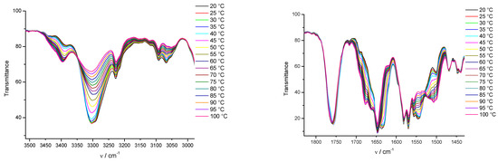 By the gel-to-sol transition, the bands were shifted to 3396, 1678 cm−1 (1a) and 3402, 1679 cm−1 (2a), respectively (Figure 2). The carboxyl starching band of 1a organogelators appeared at 1760 cm−1 and was not shifted by the increasing temperature. These results indicate that vinyl carboxylates are not connected via hydrogen bonding in the 1a/toluene self-assemblies. Contrary to 1a, the hydrogen-bounded carboxyl band at 1749 cm−1 of valine 2a in toluene was shifted to 1757 cm−1 by the gel melting, suggesting that breaking central hydrogen bonds caused significant changes in the self-assembly and surrounding of the carboxylate groups. The presence of FTIR bands at 3385 cm−1 in 1a/toluene gel—which correspond to non-hydrogen-bonded NH groups—can be explained by the specific self-assembly of the organogelator, in which all NH amide protons did not participate completely in hydrogen bonding, or by the existence of solvated molecules (Supplementary Materials Table S2). As previously noted, 1a was a poor gelator of toluene and formed gel only through the application of ultrasound. Without sonification, only small, granular gels in the solvent were observed after 0.5–1 h. The FTIR investigation indicated the same organization in the gelling forms of 1a in toluene in both methods of gel preparation (Figure S8a,b). The reproducibility of the gel-sol temperature transition was determined experimentally. After heating/cooling treatment of up to three cycles, no evidence of a chemical change was observed from FTIR spectra (Figures S18 and S19). From the obtained temperature dependent FTIR spectra of the 1a and 2a/toluene supramolecular gels, we concluded that molecules in the gels were crosslinking with multiple thermoreversible hydrogen bonds.