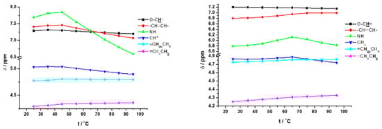 Chemical shifts of 1a (left) and (b) 2a (right) protons in toluene-d8 gels in the temperature range of 25–95 °C.