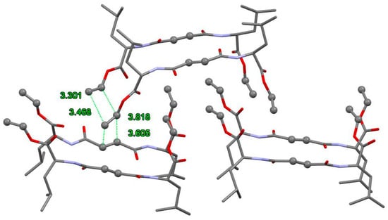 Molecular modeling studies were performed using the Tripos force field as implemented in the SYBYL-X software suite [72]. All calculations were performed in the gas phase. Gasteiger–Hückel charges were used in all calculations. The compounds were optimized for the minimization of energies and geometry optimization, convergence criterion, and root-mean-square (RMS) gradient at 0.01 kcal/mol Å, and the iteration limit was set at 10,000, by considering the determined distance-dependent dielectric constant of 4.0. The strategy for performing the energy minimization of compounds 1a and 2a was selected in accordance with the literature parameters for protein molecular modelling [73]. It was found that through the dielectric constant, ε = 4 or 20, a distance-dependent dielectric function, and stepwise energy minimization, it was possible to reproduce X-ray structures very accurately without including explicit solvent molecules. The assembly of the group of six gelator molecules was generated from known crystal structures of methyl esters of bis(leucine)fumaramide (2a) [69] and determinate crystal structures bis(valine)fumaramide (2b), by changing methyl ester groups to vinyl. The molecular modelling and energy minimization of the group of six gelator molecules 1a and 1b yielded low energy conformations interconnected by hydrogen bonds (Figure 5, Figures S14 and S15). The molecular modeling studies of 1a and 2a revealed that in these compounds both the central amide carbonyl groups encountered severe steric repulsions with the neighboring molecule amide carbonyls, respectively. In the most stable conformation of these compounds, both amide groups were in the same plane vertical orientation to the double bond of fumaryl group. As a consequence, the hydrogen-bonding moieties were all oriented along a common axis and thus strongly favored the aggregation by hydrogen bonding in only one vertical dimension. During the minimization process, the gelator molecules accumulated in the self-assembly, enabling the required proximity of vinyl reactive groups for the polymerization reaction. Furthermore, the compact packing of self-assembled molecules was responsible for the stability of the gels of fumaramide derivates 1a and 2a.