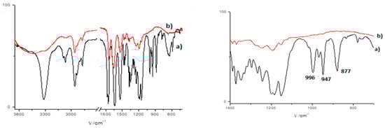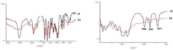 FTIR spectra of 1a (red) and the product of 1a/(DMF-H2O gel (black) gamma polymerization. Total spectra (left) and the zoom-in spectra in the range between 1400 and 700 cm−1 (right).