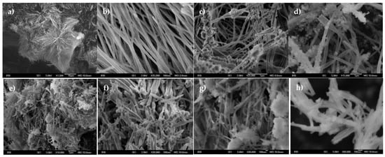 Morphological investigations by scanning electron microscopy (SEM) showed that the morphology of the gel network did not change significantly upon polymerization. Figure 10a–h confirmed the polymerization of the self-organized aggregates. All morphological forms (fibers, bundled fibers, twisted fibers, and tapes) present in the gel network were also part of the polymer network, but some quantity of microspheres was present in approximately the same quantity as the mixture of fiber bundles and single fibers, as shown in Figures S2–S6.