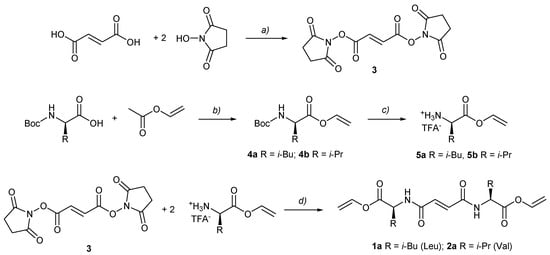 The fumaryl diesters were prepared by the Pd-catalyzed transvinylization of bis(leu or val)fumaramide with vinyl acetate accordingly to [71]. Boc-protected amino acid Boc-L-leu (231.3 mg, 1.0 mmol) or Boc-L-val (217.3 mg, 1.0 mmol) was dissolved in 4.4 mL (47.2 mmol) vinyl acetate. KOH (5.6 mg, 0.1 mmol), Pd(OAc)2 (2.2 mg, 0.01 mmol), and p-benzoquinone (2.1 mg, 0.02 mmol) were added sequentially to this vinyl ester mixture at 22 °C. After 36 h of stirring, NaBH4 (2.3 mg, 0.06 mmol) was added, and the reaction mixture was stirred for half an hour. The reaction mixture was then filtered through a pad of celite that was washed with EtOAc. Filtrate was concentrated by rotary evaporation; remaining oil was dissolved in EtOAc, washed with saturated NaHCO3(aq) and saturated brine and dried over MgSO4. The crude product was isolated by rotary evaporation and purified by column chromatography (hexanes:EtOAc, 75:25 v/v) followed by vacuum distillation to yield a yellow-to-colorless oil (60% yield). NMR spectra of the resulting products (4a and 4b) were in accordance with the literature data [68].