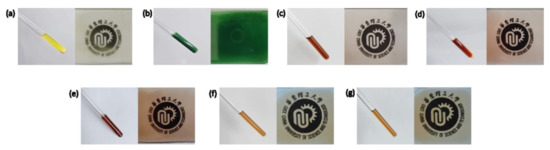 Solubility of (a) BPh; (b) BPh-B; (c) BPh-Q5; (d) BPh-Q10; (e) BPh-Q15; (f) BPh-Q20; (g) BPh-Q30 in THF, the solid content is 20%. Apply the solution on the glass to compare the transparency.