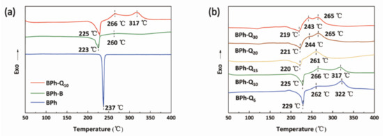 DSC curves of BPh monomers and prepolymers. (a) DSC curves of BPh, BPh-B and BPh-Q10; (b) DSC curves of BPh-Q5, BPh-Q10, BPh-Q15, BPh-Q20 and BPh-Q30, the experimental temperature ranges from 50 to 400 °C, with a heating rate of 10 °C/min (under nitrogen atmosphere) and a purge of 50 mL/min.