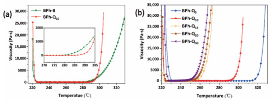 The rheological tests of BPh-Q and BPh-B were subsequently performed to further assess their curing behaviors. Neat BPh monomer showed low viscosity (0.1 Pa·s) up to 400 °C due to the slow rate of its polymerization (Figure S3). With the incorporation of BPA (10.12 wt%), the viscosity of the system decreased dramatically at 220 °C (the minimum viscosity is 0.3 Pa·s), implying the enhanced flexibility of the molecular chain of BPh resin (Figure 4a). Upon heating BPh-B to 277 °C, the viscosity rose gradually, indicating the occurrence of gelation. Compared to BPh-B, the viscosity of BPh-Q exhibited similar behavior at the initial stage (the minimum viscosity is 3 Pa·s), and then increased dramatically at around 287 °C (10 °C higher than BPh-B), affording an extended processing window. In general, the rising slope of the rheological curve after gelation could indirectly reflect the curing rate [37]. Therefore, the sharp slope of BPh-Q10 above 287 °C further confirmed the accelerated polymerization by QCB. Furthermore, as the QCB content was increased from 5 to 30 wt% (Figure 4b), the processing window of BPh-Q was significantly narrowed and the temperature corresponding to the appearance of gelation decreased accordingly. The results indicated that the polymerization degree of BPh-Q prepolymer was improved with increasing QCB content under the same experimental conditions.