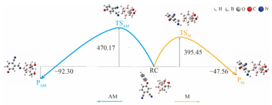 In order to further explore the hydroboration of B-H with C≡N groups, the molecular calculations were performed. From the calculation results, two possible pathways were found for the addition reaction of BPh and QCB (Figure 7). The barrier height of path AM (for an anti-Markovnikov addition reaction, the B atom was connected with the N atom, Scheme 1a) was 470.17 kJ/mol, which is higher than that of path M (395.45 kJ/mol, for a Markovnikov addition reaction, the B atom was connected with the C atom, Scheme 1b) [47]. Besides, the bond lengths of C-N bond and B-H bond in TSM were 1.17 and 1.45 Å, respectively, which were longer than in TSAM (1.28 and 2.59 Å), confirming that these two bonds were greatly weakened in TSM (Table S1). Thus, path M was the more favorable reaction channel. In other words, the addition reaction of BPh and QCB mainly occurred in the way of Markovnikov addition reaction. In combination with the FTIR results, it could be inferred that, during the curing process, BPh-Q10 firstly produced a large number of N-H bonds and then formed ionized intermediates to promote the cyanide polymerization reaction. With gradually increasing temperature of the polymerization, the energy required for AM was sufficient, leading to the formation of C-H bonds through anti-Markovnikov addition reaction of the remaining cyanide groups and QCB.