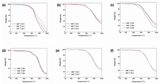 TGA curves of (a) BPh-B; (b) BPh-Q5; (c) BPh-Q10; (d) BPh-Q15; (e) BPh-Q20; (f) BPh-Q30 in air, the experimental temperature ranges from 50 to 1000 °C, with a heating rate of 10 °C/min (under nitrogen or air atmosphere) and a purge of 40 mL/min.