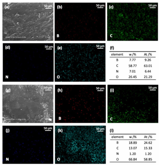 Micro morphology and energy spectrum analysis of BPh-Q10 thermosets before and after thermal oxidation treatment, (b–e) the corresponding EDS elemental mapping images before thermal oxidation treatment, (a,g) SEM of BPh-Q10 thermosets before and after thermal oxidation treatment, (f,l) the mass percentage of the surface element before and after thermal oxidation treatment and (h–k) the corresponding EDS elemental mapping images after thermal oxidation treatment. The gold spray time was 30 s.