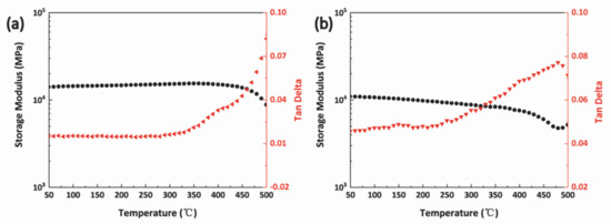 Dynamic mechanical analysis (DMA) is regarded as an effective test to characterize the thermo-mechanical properties of BPh-Q and BPh-B (Figure 10). With the increase of temperature, the storage modulus of the resins hardly changed, suggesting both the resins have qualified thermo-mechanical properties. Notably, the storage modulus of BPh-Q10 was as high as 15.6 GPa, while BPh-B was 10.9 GPa, indicating that the BPh-Q10 was more rigid. Moreover, the tan δ of BPh-Q10 did not form a complete peak in DMA measurement even when the temperature is near 500 °C, compared with BPh-B (Tg is 474 °C). It can be concluded from the comparison with BPh-B that the prepolymerization with QCB does increase the service temperature of BPh.