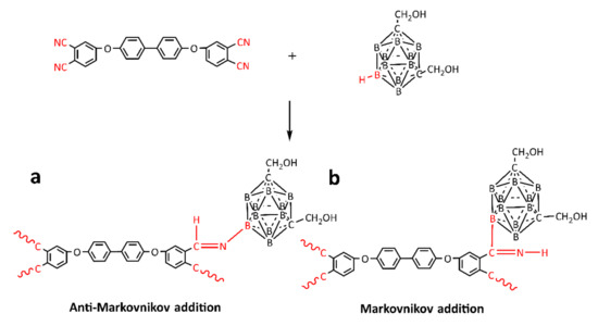 Remarkably, the combination of both organic and inorganic constituents opened an efficient way to fabricate phthalonitrile resin [3,24,25]. As a polyhedral cage boron cluster compound, carborane was formed when some boron atoms in the cluster were replaced by carbon atoms [26]. This particular structure endowed the carborane molecules and their derivatives with aromatic properties and good thermal stability [27,28]. 1,7-bis(hydroxymethyl)-m-carborane (QCB) introduces hydroxyl methyl to two C atoms of carborane (Figure 1). The hydroxyl group and B-H of QCB can provide active hydrogen atoms to catalyze the cyanide polymerization reaction, thereby improving the thermostability of phthalonitrile resin.