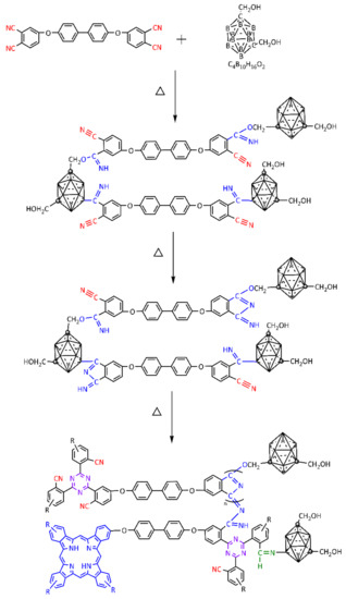 Based on all these results, the mechanism of the curing reaction of cyanide catalyzed by hydroxyl and B-H groups in QCB was illustrated in Scheme 2. The curing reaction of BPh was intrinsically the nucleophilic reaction of the cyano groups. The hydroxyl and B-H groups in QCB provided reactive hydrogen atoms to attack the cyano groups, which separated the positive and negative electron centers of the cyanide groups and further formed the electronegativity centers. Moreover, the hydroxyl groups and the active hydrogen atoms on B-H were transferred to N-, thereby triggering a continuous nucleophilic reaction and forming triazine ring structures by the intermolecular polymerization of cyanides. Subsequently, the isoindoline structures were produced by linear growth of the triazine ring structures, followed by the final formation of phthalocyanine rings via the intramolecular polymerization [6,35,48]. Except for hydroxy groups, B-H bonds in QCB also provided active hydrogen atoms [47]. This could be explained by the following reasons: carbon and boron atoms in carborane both were six-ligand, obeying Hückel’s rule and exhibited aromaticity, which caused low energy of the B-H bond. The cage structure of carborane made the boron atoms on neighboring carbon atoms be slightly positive and prone to occur nucleophilic substitution reactions [28]. Therefore, when curing with QCB catalyzers, a large number of reaction intermediates were generated and the rate of cyclization of the intermediates was further enhanced. This also explained why there were two obvious exothermal peaks in the DSC spectra of BPh-Q10. Moreover, with further increased content of QCB, more B-H and hydroxyl groups produce more reaction intermediates, allowing triazine and phthalocyanine rings to be generated at lower temperatures, resulting in the advance of the second curing peak.