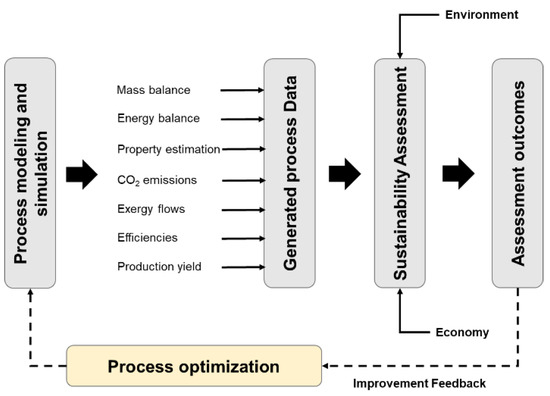 A schematic sustainability assessment approach combining process modeling, simulation, and optimization.