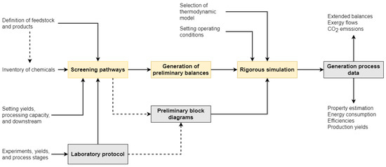The procedure acknowledges the relevance of understanding the particular characteristics of bioprocess systems, since their attributes differ, in many ways, from the traditional conception of conventional chemical processes. Reported data and laboratory experiments reports are used as data about raw materials, their molecular structures, and chemical compositions. Moreover, selecting suitable mathematical schemes and thermodynamic models that fit a system is crucial for its comprehension, given the absence of reliable and generalized frameworks [18].
