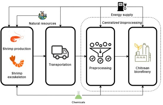 The goal and scope aim to assess and estimate environmental impacts for the base case and an optimized process to evaluate the improvement on the environmental sustainability performance [48]. The functional unit is set to be 1 kg of chitosan. This functional unit was selected considering the system boundaries (cradle to biorefinery gate) and the main goal of the methodology. That is, the assessment and improvement of a process technology around the factory level. Therefore, this functional unit will define the mass/energy flows and impacts in terms of chitosan.