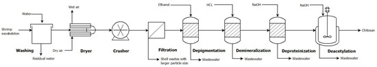 Shrimp shells were directed to the washing unit for cleaning, then to dried and crushed for particle size reduction. In a filter, treated shell wastes with particle-size higher than 0.5 mm were screened and extracted from the stream. The treated exoskeleton was sent to depigmentation (with ethanol) and demineralization (hydrochloric acid). These stages reject minerals and pigments (like astaxanthin) while preventing chitin hydrolysis [52]. The treated material was deproteinized via sodium hydroxide, and thus converted into chitin. This component is the primary precursor of chitosan. Partial deacetylation of chitin was developed to obtain the product using sodium hydroxide [53].