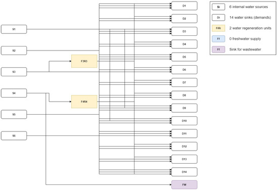 The WRN employs regeneration units to reject the pollutants in water and reduce the concentration below the required value. In order to avoid compromising the product integrity, this value was set as . If , the wastewater streams can be directed to a source supply, bypassing the regeneration units. If the above condition was not met, the wastewater stream was sent to a regeneration unit and then directed to a source supply. The tradeoff of designing a WRN is that the system improves water consumption, but installing regeneration units demands an economic effort. The WRN reached the minimum freshwater target, regenerating 269,646.90 kg/h through two regeneration units and generating a total directly recycled water mass flow of 853,387.29 kg/h. The optimized design comprises six sources and fourteen demands, and employs two regeneration units to achieve water-saving objectives. Table S6 summarizes water flows and interconnecting streams for the optimized WRN.