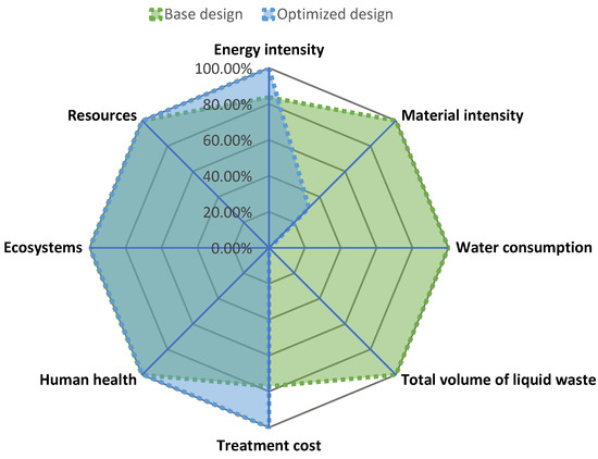 A second scenario was tested to analyze the variation in the sustainability footprint if the weighting factors were changed to reflect another prioritization. In this case, the analysis split the relevance grouping indicators into the following areas: energy, efficiency, water management, life cycle (environment), and economy. In this sense, water management includes indicators for measuring water-recycling performance. Each main area corresponded to a weighting factor of 1.0 (economy, energy, and efficiency), while water management and life cycle split their weighting factors between their corresponding indicators (0.5 for each water management indicator and 0.33 for each environmental impact category). The results of this scenario reflect for the base case and for the optimized case. In this scenario, the best choice based on sustainability performance was still an optimized design. These outcomes enhance the conclusion given for the first evaluated scenario, where the optimized design remains the best alternative and was genuinely an improved version of the initial design.