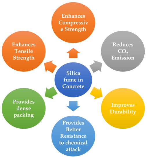 - Different researchers have utilized silica fume in concrete in different percentages to enhance the mechanical properties of concrete. The accurate expressions and models can efficiently increase the utilization of hazardous SF in the concrete on the industrial level in construction practices rather than accumulating it as industrial waste. The replacement of silica fume with cement and determining its optimum percentage in concrete will help promote sustainable development by reducing energy consumption, landfilling, and greenhouse gas emissions.
