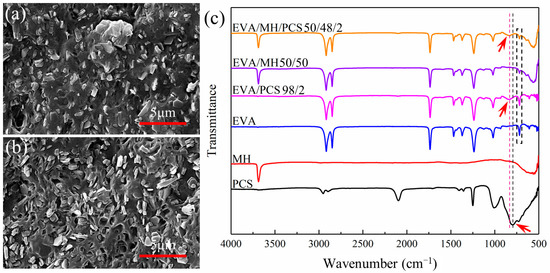 The SEM images of (a) EVA/MH 50/50 and (b) EVA/MH/PCS 50/48/2; (c) the FTIR spectra of the composites.