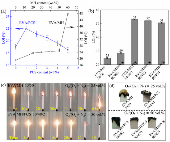 The LOI test results: (a) the LOI values of EVA with different PCS and MH content; (b) the LOI values of the EVA/MH with different PCS content; (c) the burning state during testing of EVA/MH 50/50 and EVA/MH/PCS 50/49/1, and (d) the pictures of the extinguished residues after testing.