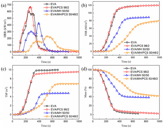 The combustion behaviors of EVA and its composites: (a) HRR, (b) THR, (c) TSP, and (d) mass.