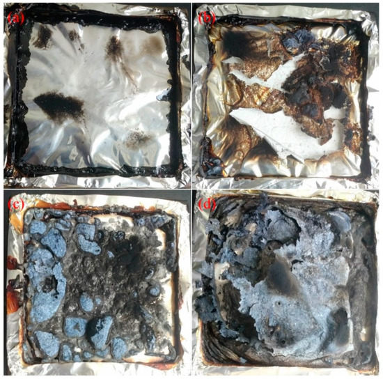 The digital photographs of the residue after the CONE test: (a) EVA, (b) EVA/PCS, (c) EVA/MH, and (d) EVA/MH/PCS.