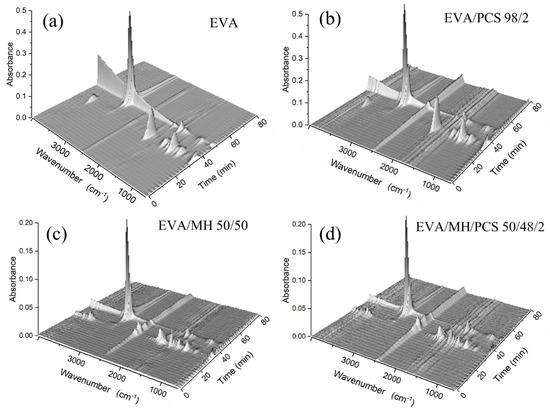 Three-dimensional diagrams of gases evolved in the thermal degradation of EVA and its composites: (a) EVA, (b) EVA/PCS, (c) EVA/MH, and (d) EVA/MH/PCS.