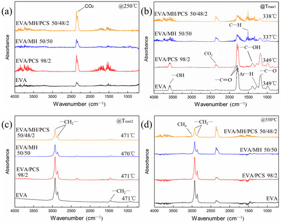 No obvious changes were observed in EVA or EVA/MH 50/50 composites with or without PCS. In terms of the EVA/MH and EVA/MH/PCS 50/48/2 composites, the bands at 3580 cm−1, 1798 cm−1, 1385 cm−1, and 1175 cm−1 corresponding to carbonyl or carboxyl became weaker, while the band at 1509 cm−1 corresponding to methyl was dominant (Figure 7b), implying that products containing carbonyl or carboxyl were effectively inhibited by MH. Only the bands at 2930 cm−1, 2860 cm−1, and 1460 cm−1 were observed in the FTIR curves of gas released in the second degradation step of EVA composites (Figure 7c), implying that hydrocarbons were the dominant products in this step. There were still infrared absorbance peaks of methyl and methylene in the final stage (Figure 7d), corresponding to the further degradation of the residue char. As expected, the band at 3019 cm−1 (C–H stretching in methane) occurred in the final degradation products of EVA/MH/PCS 50/48/2, while this was not of the case with EVA/PCS 98/2—probably due to the interaction between the tarry residue of EVA and the residue of PCS, which inhibited the production of methane; this interaction became weak with the presence of active magnesium oxide, which had catalytic effect on the carbonaceous residue [37].
