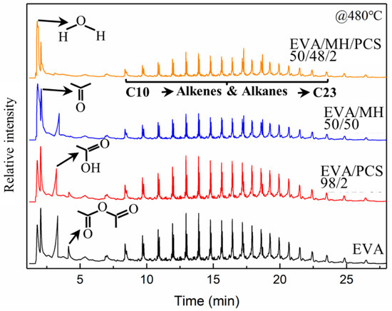 The EVA and its composites were pyrolyzed at 480 °C, where both vinyl acetate units and polyethylene units would decompose simultaneously; the resulting pyrograms are summarized in Figure 8. There were similar alkene and alkane products generated from EVA and its composites, and four kinds of small molecule substances were found in the pyrolyzates of EVA and EVA/PCS composites—namely, water, acetone, acetic acid, and acetic anhydride, which were derived from vinyl acetate units [41]. Meanwhile no acetic anhydride was found in the pyrolyzates of EVA/MH 50/50, and no acetic anhydride or acetic acid were found for EVA/MH/PCS composites.