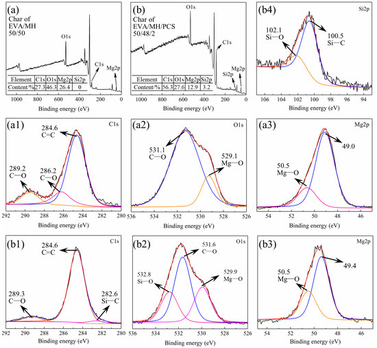 The XPS spectra of the surface char of (a) survey spectrum of EVA/MH and (b) survey spectrum of EVA/MH/PCS. (a1,b1) C1s, (a2,b2) O1s, (a3,b3) Mg2p, and (b4) Si2p.