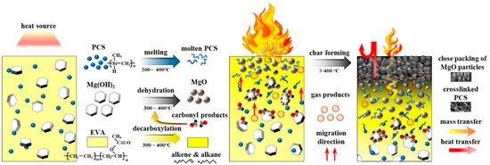 The char formation process is elaborated in Figure 12. The decomposition reaction of MH proceeded from the edge of the plate or cracks in the interface towards the center of the crystal [49]. The acetic acid generated by decarboxylation of vinyl acetate groups in EVA matrix was more likely to interact with MH and lead to the formation of spherical MgO particles [50]. Spherical MgO particles tend to form close packing. The intermediate products of PCS interacted with MgO and magnesium silicate formed in the surface of MgO particles, which acted as a binder between the intermediate products of PCS and MgO particles; the intermediate products of PCS also tended to form a three-dimensional net structure, which could gather MgO particles effectively. Thus, a compact and cohesive char formed.