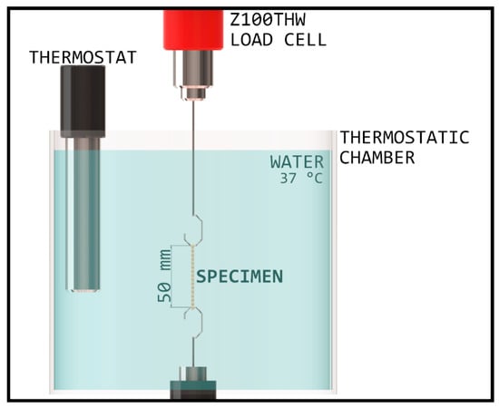 After tensile strength testing, force degradation was measured. The oral environment was simulated with a thermostatic chamber and waterbath, wherein the temperature was set to 37 °C ± 2 °C. The chamber was built inside the Zwick/Roell Z100THW Universal material tester with 1 kN load cell (Figure 1).
