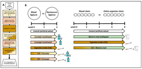 (A) Schematic diagram of force degradation measurement protocol, in case of untreated elastomers. (B) Experimental protocol for measuring force degradation of Masel and Dentaurum ligatures, as well as Masel and Ortho organizer chains due to chemical and mechanical plaque control.