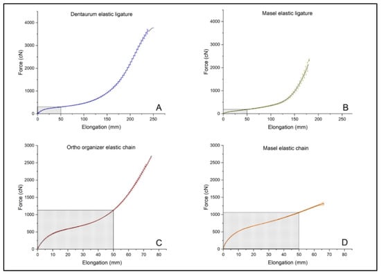 Tensile strength of untreated, intact (A) Dentaurum elastic ligature, (B) Masel elastic ligature, (C) Ortho organizer elastic chain, (D) Masel elastic chain. Shaded rectangles indicate the range of their general usage based on clinical experience (n = 3/elastomer).