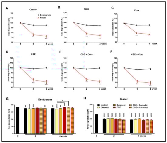 Comparison of percentages of force decay of (A) untreated control, (B) Corsodyl, (C) Curasept, (D) cigarette smoke (CS), (E) CSE + Corsodyl, and (F) CSE + Curasept treated Dentaurum (black) and Masel (red) elastic ligatures at 50 mm extension. *** p < 0.0001 vs. Dentaurum, (n = 6/group; two-way ANOVA and Sidak post hoc tests). Force degradation of (G) Dentaurum and (H) Masel elastic ligatures to external factors during the 4-week-long protocol. ## p < 0.005, ### p < 0.0005, #### p < 0.0001 vs. intact values; * p < 0.05, ** p < 0.005 highlightsdifference between two treatments at given time. (n = 6/group, two-way ANOVA, and Sidak post hoc tests).