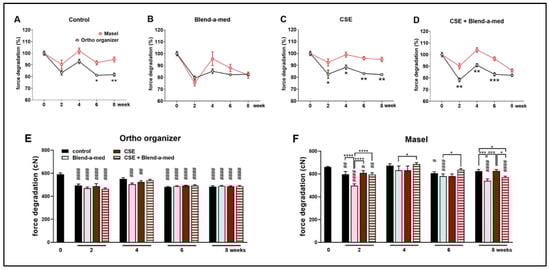 Percentages of force degradation of (A) control, untreated; (B) Blend-a-med; (C) cigarette smoke and (D) cigarette smoke + Blend-a-med treated Ortho organizer (black) and Masel (red) elastic chains at 50 mm extension. Force degradation of (E) Ortho organizer and (F) Masel elastic chains to different external factors in cN n = 6/group; two-way ANOVA and Sidak post hoc tests, * p < 0.05, ** p < 0.005, *** p = 0.0005 vs. Masel. Two-way ANOVA and Tukey post hoc tests. # p < 0.05, ## p < 0.005, ### p < 0.0005, #### p < 0.0001, vs. intact values; * p < 0.05, *** p < 0.0005, **** p < 0.0001 difference between two treatments at given timepoint.