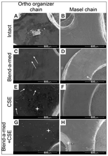 Representative electron microscopy images of (A,C,E,G) Ortho Organizer and (B,D,F,H) Masel elastic chains after 8 weeks of exposure to (A,B) control environment (artificial saliva), (C,D) cleaning with Blend-a-med toothpaste, (E,F) cigarette smoke as well as (G,H) cigarette smoke combined with mechanical cleaning with toothpaste. The white arrows indicate the microlaesions, and a white start highlights particles from smoke exposure. 80× magnification.