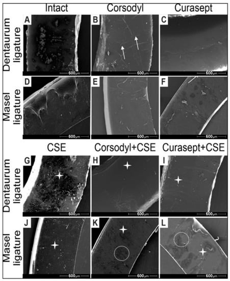 The SEM imaging also revealed structural changes on the surface of ligatures. Both the Corsodyl and Curasept treatments caused minor cracks and lesions on the surface (Figure 7B,C,E,F), which was more pronounced in case of Corsodyl. Particles from smoke were observable on all ligatures with CSE treatment (Figure 7G,J). The most prevalent degradation and structural damage could be observed on the Masel ligature exposed to Corsodyl and CSE, and to Curasept and CSE (Figure 7K,L).