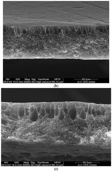 The effect of polymer concentration on the morphological properties of asymmetric membranes was evaluated by SEM analyses. The membranes prepared at different polymer concentrations exhibited an asymmetric cross-section structure, with a thin selective layer, and finger-like and sponge-like pore structures in the sub-layer (see Figure 2a–c). The formation of the skin layer is due to the instantaneous demixing of solvent and non-solvent during the phase inversion process [22]. This structure is due to the high mutual diffusivities of water and DMF during the phase separation [23]. In addition, the formation of macro-voids is obtained when the diffusion rate of the non-solvent into the polymer-poor phase overcomes the solvent diffusion rate. An increase in the polymer concentration determined a decrease in the dense skin layer. This result is attributed to the higher viscosity of the dope solution that blocks the diffusion exchange between solvent (DMF) and non-solvent (water).