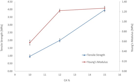 Tensile strength and Young’s modulus of the CA membranes prepared at different polymer concentrations.