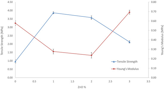 In order to investigate the effect of ZnO in Figure 5, tensile strength and Young’s modulus of membranes n. 1, 2, 3 and 4 are reported. For a fixed content in CA (10%) and different amounts of ZnO the Figure 6 shows a decrease in Young’s modulus and an increase in tensile strength for the membrane with 1 and 2% of ZnO. The standard deviation resulted as less than 5%. This result was derived from the incorporation of ZnO additive could be due to the increased flexibility of the CA chains caused by a good interaction between the filler particles (ZnO) and the polymeric chains of CA and consequently transferred the stress between fillers and polymer, thus showing a lower modulus and higher strength. However, with a higher percentage of ZnO (3%) the filler polymer interactions may decrease, and an opposite effect is observed with higher Young’s modulus but lower strength.