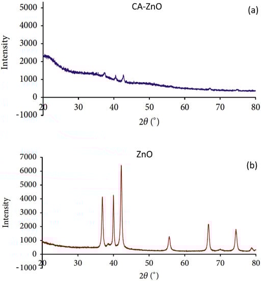 The presence of ZnO nanoparticles in the membrane matrix is confirmed by XRD analysis. Figure 7a,b show the diffractograms of CA supported ZnO nanoparticles: (A) membrane, and ZnO nanoparticles, and (B) the ZnO diffractogram exhibited dominant peaks at 2θ angles of 36.91°, 39.98°, 42.17°, and 55.78° which correspond to the main characteristic peaks of zinc-oxide nanoparticles. The CA’s composite membrane also showed the characteristic peaks of ZnO nanoparticles The XRD results indicated the presence of ZnO nanoparticles in the composite membranes.
